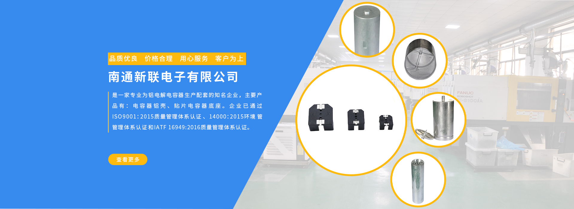 南通新聯電子有限公司是一家專業為鋁電解電容器生產配套的知名企業,主要產品有:電容器鋁殼、貼片電容器底座。企業已通過ISO99001:2015質量管理體系認證和14000:2015環境管理體系認證。企業... MORE